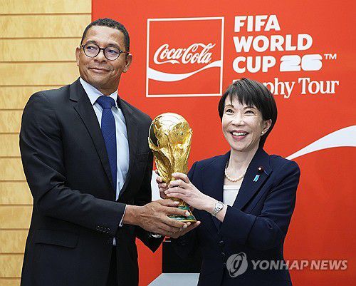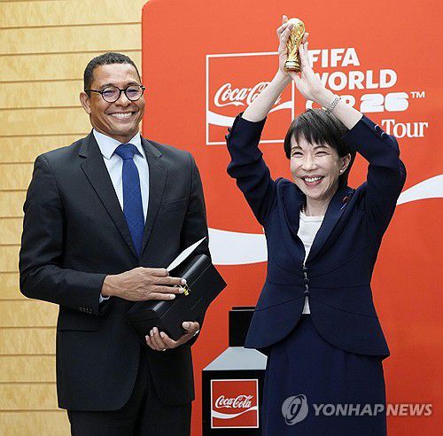 일본 총리실은 지난 19일 사회관계망서비스(SNS)를 통해 사나에 총리가 국제축구연맹(FIFA) 월드컵 트로피 투어를 맞아 일본에 도착한 월드컵 트로피를 들어 올리는 모습을 영상으로 공개했다.