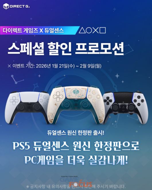 다이렉트 게임즈 X 듀얼센스: ‘원신 한정판’ 출시 기념 네이버페이 포인트 쿠폰 지급 이벤트 21일부터 진행되는 ‘다이렉트 게임즈 X 듀얼센스’ 이벤트 기간 동안, 다이렉트 게임즈에서 ‘듀얼센스 무선 컨트롤러 – 원신 한정판’을 구매한 유저를 대상으로 네이버페이 포인트 쿠폰 증정 이벤트를 실시한다. 해당 쿠폰은 주문 건당 1회 제공되며, 2026년 2월 28일(토)까지 교환 가능하다.