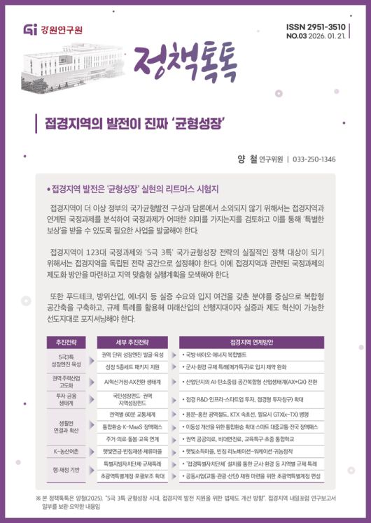 [스포츠서울ㅣ춘천=김기원기자]강원연구원(원장 배상근)은 “접경지역의 발전이 진짜 ‘균형성장’”이라는 제목으로 제2026-3호 정책톡톡을 발간했다.