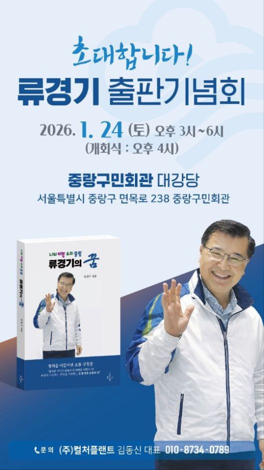 류경기 출판기념회 초대장으로, 류경기 중랑구청장이 미소를 지으며 손을 흔들고 있다. 포스터에는 ‘류경기 출판기념회, 2026년 1월 24일 토요일 오후 3시부터 6시, 중랑구민회관 대강당’이라고 적혀 있다. |