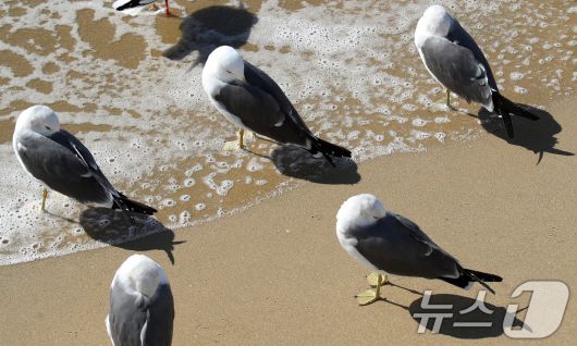 (부산=뉴스1) 윤일지 기자 = 전국적으로 한파가 기승을 부린 21일 부산 해운대해수욕장에서 갈매기들이 부리를 깃털에 파묻고 햇볕을 쬐고 있다. 2026.1.21/뉴스1