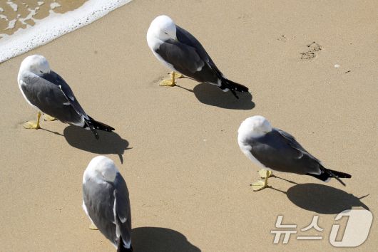 (부산=뉴스1) 윤일지 기자 = 전국적으로 한파가 기승을 부린 21일 부산 해운대해수욕장에서 갈매기들이 부리를 깃털에 파묻고 햇볕을 쬐고 있다. 2026.1.21/뉴스1