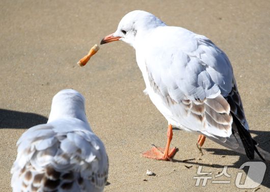 (부산=뉴스1) 윤일지 기자 = 21일 부산 해운대해수욕장에서 갈매기가 누군가가 버린 담배꽁초를 먹다 뱉고 있다. 2026.1.21/뉴스1