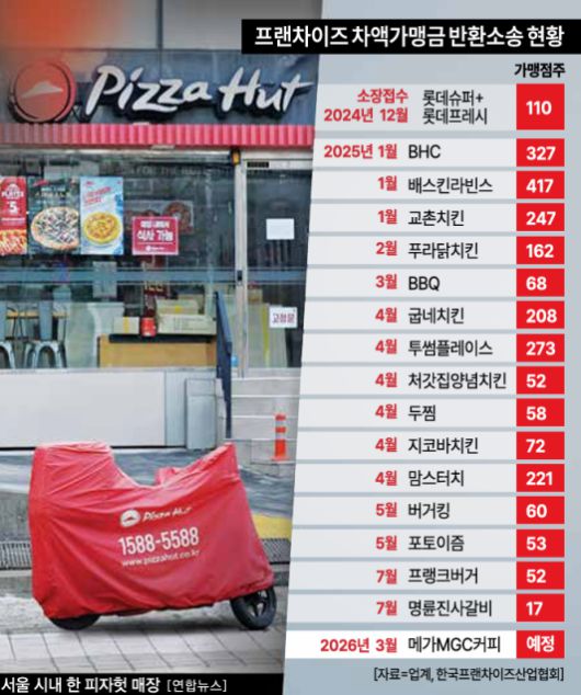 집단소송이 진행 중인 브랜드도 적지 않다. 피자헛 가맹점주들을 대리한 법무법인 YK는 BBQ, 두찜, 버거킹, 배스킨라빈스, bhc, 교촌치킨, 투썸플레이스 등 16개 브랜드 본사를 상대로 차액가맹금 반환 소송을 진행 중이다. 오는 22일에는 울산지방법원에서 지코바치킨 가맹점주 72명이 제기한 소송의 변론기일이 예정돼 있으며, 다음달에도 3개 브랜드의 재판이 열릴 전망이다.