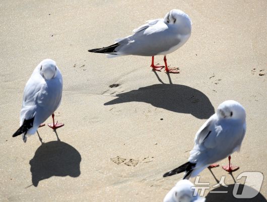 (부산=뉴스1) 윤일지 기자 = 전국적으로 한파가 기승을 부린 21일 부산 해운대해수욕장에서 갈매기들이 부리를 깃털에 파묻고 햇볕을 쬐고 있다. 2026.1.21/뉴스1
