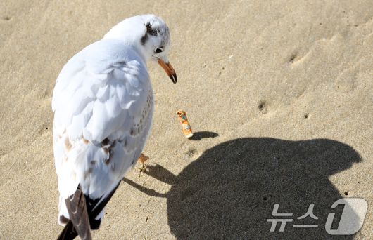(부산=뉴스1) 윤일지 기자 = 21일 부산 해운대해수욕장에서 갈매기가 누군가가 버린 담배꽁초를 먹다 뱉고 있다. 2026.1.21/뉴스1yoonphoto@news1.krCopyright ⓒ 뉴스1. All rights reserved. 무단 전재 및 재배포, AI학습 이용 금지.