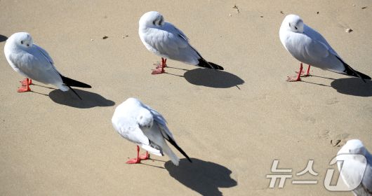 (부산=뉴스1) 윤일지 기자 = 전국적으로 한파가 기승을 부린 21일 부산 해운대해수욕장에서 갈매기들이 부리를 깃털에 파묻고 햇볕을 쬐고 있다. 2026.1.21/뉴스1