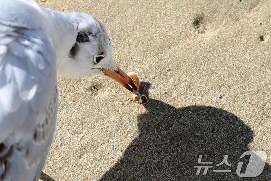 (부산=뉴스1) 윤일지 기자 = 21일 부산 해운대해수욕장에서 갈매기가 누군가가 버린 담배꽁초를 부리로 물고 있다. 2026.1.21/뉴스1