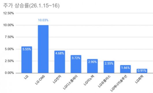 지난 14일 종가부터 16일 종가까지 2일간 주가 상승률은 LG씨엔에스가 10%나 뛰었고, 지주사 ㈜LG도 5.6% 올랐다.