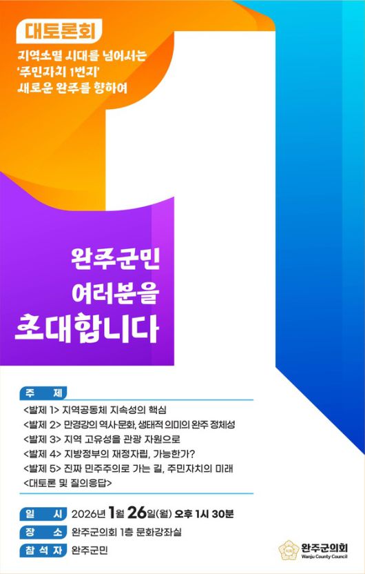 토론회에는 완주군의회 의원을 비롯해 완주군민, 완주군 공무원 등 70여 명이 참석할 예정이며, 주제 발표와 토론, 질의응답이 결합된 참여형 토론 방식으로 진행된다.