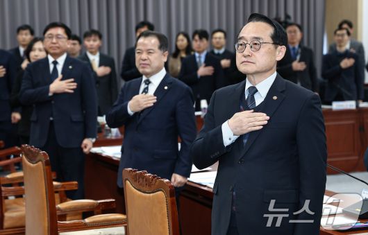 (과천=뉴스1) 김도우 기자 = 허철훈 중앙선관위 사무총장, 위철환 중앙선관위 상임위원장을 비롯한 참석자이 21일 경기 과천 중앙선거관리위원회에서 열린 2026년도 주요업무계획 회의 및 청렴실천 서약식에서 국민의례를 하고 있다. 2026.1.21/뉴스1pizza@news1.krCopyright ⓒ 뉴스1. All rights reserved. 무단 전재 및 재배포, AI학습 이용 금지.