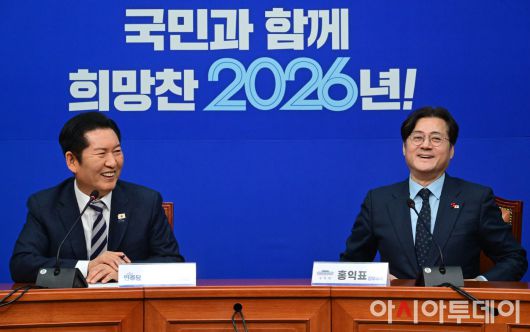 아시아투데이 이병화 기자 = 정청래 더불어민주당 대표가 21일 국회를 찾은 홍익표 청와대비서실 정무수석을 접견하고 있다.