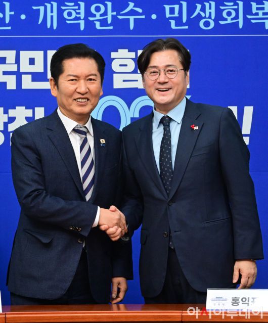 아시아투데이 이병화 기자 = 정청래 더불어민주당 대표가 21일 국회를 찾은 홍익표 청와대비서실 정무수석과 악수를 나누고 있다.