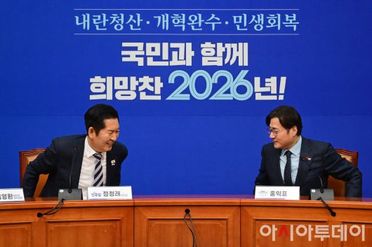 아시아투데이 이병화 기자 = 정청래 더불어민주당 대표가 21일 국회를 찾은 홍익표 청와대비서실 정무수석을 접견하고 있다.