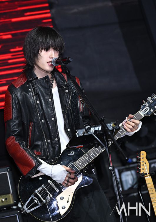 (MHN 이현지 기자) 신인 보이 밴드 에이엠피(AxMxP) 김신이 21일 오후 서울 서대문구 예스24 원더로크홀에서 진행된 첫 미니앨범 '앰플리파이 마이 웨이'(Amplify My Way) 쇼케이스에서 신곡을 선보이고 있다.