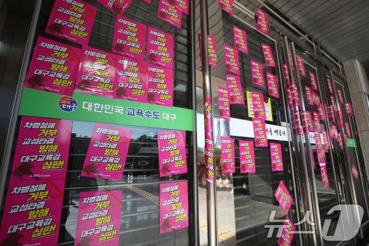 (대구=뉴스1) 공정식 기자 = 21일 오후 전국교육공무직본부 대구지부(대구 학비노조) 관계자들이 대구 수성구 대구교육청 본관 출입문에 '차별철폐 거부, 교섭타결 방해' 등 강은희 대구교육감을 규탄하는 내용의 스티커를 붙여 놓았다. 2026.1.21/뉴스1