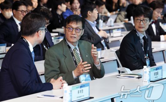 (서울=뉴스1) 최지환 기자 = 이창용 한국은행 총재가 21일 오후 서울 중구 한국은행에서 열린 한국은행·네이버 공동 AX(인공지능 전환) 컨퍼런스에서 류제명 과학기술정보통신부 2차관과 대화를 나누고 있다. 오른쪽은 이해진 네이버 이사회 의장. 2026.1.21/뉴스1