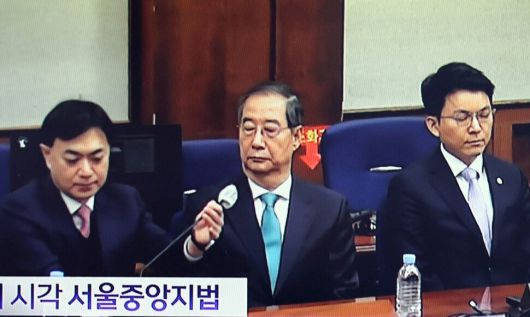내란중요임무종사 등 혐의로 기소된 한덕수 전 국무총리가 21일 서울 서초구 서울중앙지방법원 417호 형사대법정에 출석해 있다. 서울중앙지법 재판 중계화면 갈무리 |