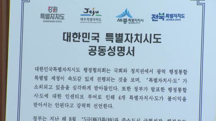 강원과 제주를 포함해 세종과 전북 등 4개 특별시·도로 구성된 '특별자치시도 행정협의회'는 최근 정부가 추진하는 '5극 3특' 광역 행정 통합 논의와 관련해 역차별에 대한 우려를 나타냈습니다.