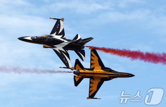 지난해 10월 경기 성남시 수정구 서울공항에서 열린 '서울 국제 항공우주 및 방위산업 전시회'(서울 ADEX 2025)'에서 공군 특수비행팀 블랙이글스가 화려한 에어쇼를 선보이고 있다. 뉴스1 ⓒ News1 김영운 기자 |
