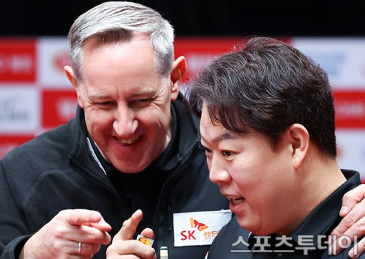 [고양(경기)=스포츠투데이 팽현준 기자] 21일 경기도 고양 킨텍스 PBA스타디움에서 열린 '웰컴저축은행 PBA 팀리그 2025-2026' 하나카드와 SK렌터카의 챔피언결정전 5차전을 앞두고 SK렌터카 에디 레펀스와 강동궁이 웜업을 하며 이야기를 나누고 있다. 2026.01.21. [스포츠투데이 팽현준 기자 sports@stoo.com]