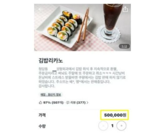 메뉴 설명란에는 “청담동 ○○성형외과에서 김밥을 취식한 뒤 지속적으로 환불과 취소를 반복했다”며 “주문 금지를 안내했음에도 주말마다 주문이 이어져 시간과 비용, 정신적 부담이 컸다. 이에 해당 플랫폼에서는 김밥을 판매하지 않기로 했다”고 안내했다.