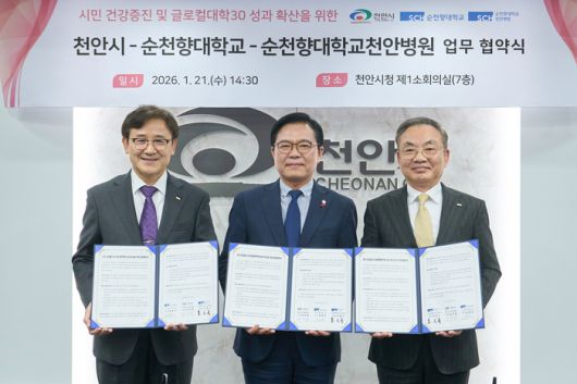 천안시는 21일 시청 제1소회의실에서 순천향대학교, 순천향대학교 부속 천안병원과 '노인 건강증진 과 글로컬 대학 30 성과 확산을 위한 업무협약'을 체결했다.