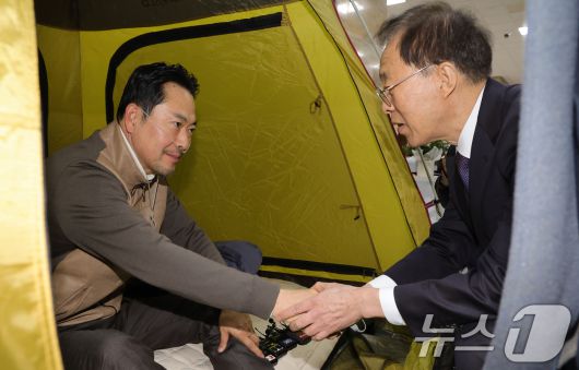 (서울=뉴스1) 신웅수 기자 = 단식 중인 장동혁 국민의힘 대표가 21일 서울 여의도 국회 로텐더홀 단식 농성장을 찾은 이석연 국민통합위원장과 인사하고 있다. (공동취재) 2026.1.21/뉴스1phonalist@news1.krCopyright ⓒ 뉴스1. All rights reserved. 무단 전재 및 재배포, AI학습 이용 금지.