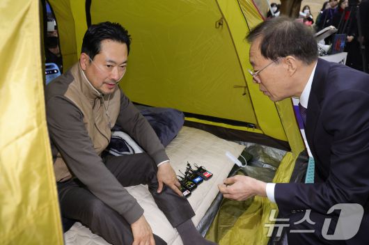 (서울=뉴스1) 신웅수 기자 = 단식 중인 장동혁 국민의힘 대표가 21일 서울 여의도 국회 로텐더홀 단식 농성장을 찾은 이석연 국민통합위원장과 대화하고 있다. (공동취재) 2026.1.21/뉴스1