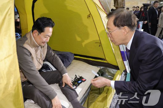 (서울=뉴스1) 신웅수 기자 = 단식 중인 장동혁 국민의힘 대표가 21일 서울 여의도 국회 로텐더홀 단식 농성장을 찾은 이석연 국민통합위원장과 대화하고 있다. (공동취재) 2026.1.21/뉴스1phonalist@news1.krCopyright ⓒ 뉴스1. All rights reserved. 무단 전재 및 재배포, AI학습 이용 금지.