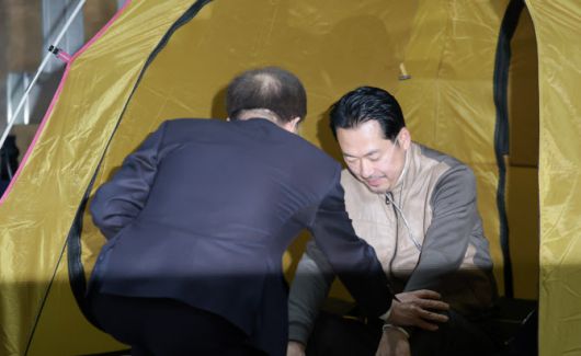통일교·공천헌금 ‘쌍특검’ 수용을 요구하며 이레째 단식 중인 국민의힘 장동혁 대표가 21일 서울 여의도 국회 로텐더홀 단식 농성장을 찾은 이석연 국민통합위원장과 대화하고 있다. (사진 = 연합뉴스) |