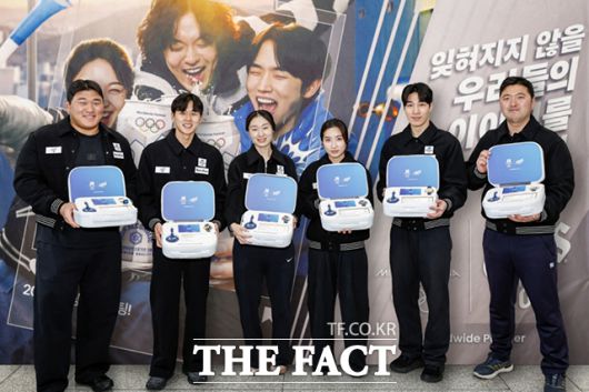 [더팩트ㅣ박헌우 기자] 2026 밀라노·코르티나담페초 동계올림픽 공식 파트너 카스가 20일 충북 진천 국가대표선수촌에서 '카스 0.0 응원 부스'를 운영한 가운데 대한민국 유도 남자 국가대표 김민종 선수와 근대 5종 남자 국가대표 전웅태 선수, 쇼트트랙 여자 국가대표 최민정·김길리 선수, 쇼트트랙 남자 국가대표 황대헌 선수, 양궁 남자 국가대표 김우진 선수(왼쪽부터)가 응원 키트를 들고 기념촬영을 하고 있다.