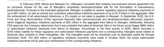 21일 업계에 따르면 미국머크(MSD)는 2025년 3분기 보고서에서 “2024년 2월 알테오젠과의 피하주사 제형 키트루다 개발 계약을 비독점에서 독점 계약으로 전환했다”며 “개정된 계약에 따라 알테오젠은 누적 기준 최대 10억 달러에 달하는 연간 및 누적 매출 연동 마일스톤 지급 대상이 되고, 순매출에 대해 2%의 로열티를 지급받는다”고 명시했다.