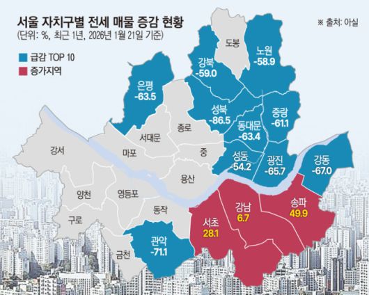 정부의 대출 규제와 토지거래허가구역(토허제) 확대 여파로 비강남권 전세 매물 씨가 마른 수준으로 줄어든 반면 대규모 입주가 이어진 강남권은 오히려 매물이 쌓이며 수급 불균형이 심화하고 있다. 서울 아파트 전세 시장이 자치구별로 극심한 온도 차를 보이며 양극화의 늪에 빠졌다.