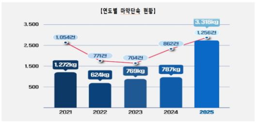 관세청은 지난 한 해 동안 국경단계에서 총 1256건, 3318kg의 마약류를 적발했다고 21일 밝혔다. 전년과 비교하면 적발건수는 46%, 중량은 321% 증가하며 모두 역대 최고치를 기록했다.