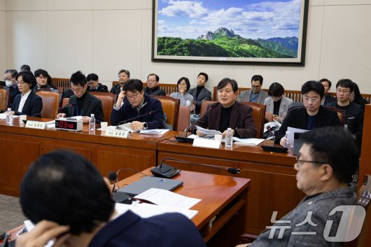 (서울=뉴스1) 유승관 기자 = 신언직 노동공제연합 사단법인 풀빵 노동공제학습원장이 21일 서울 여의도 국회에서 열린 제431회 국회(임시회) 기후에너지환경노동위원회의 노동 형태 변화에 따른 노동약자 및 일하는 사람 보호 관련 법률안에 대한 입법공청회에서 진술하고 있다. 2026.1.21/뉴스1