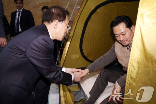 (서울=뉴스1) 신웅수 기자 = 단식 중인 장동혁 국민의힘 대표가 21일 서울 여의도 국회 로텐더홀 단식 농성장을 찾은 이석연 국민통합위원장과 대화하고 있다. (공동취재) 2026.1.21/뉴스1