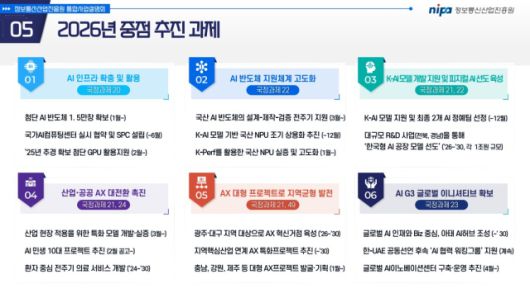 NIPA는 올해 ▲AI 인프라 및 한국형 AI(K-AI) 모델 중심 중점 사업 ▲에이전틱·피지컬 AI 신규 사업 ▲공공 AX(인공지능 전환) 확대 ▲사업 선정·평가 체계 개선 등 4개 축으로 사업 구조를 재편했다.