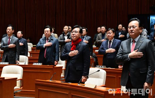 아시아투데이 이병화 기자 = 송언석 국민의힘 원내대표를 비롯한 참석 의원들이 21일 국회에서 열린 긴급 의원총회에서 국민의례를 하고 있다. ⓒ "젊은 파워, 모바일 넘버원 아시아투데이"