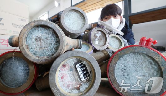(수원=뉴스1) 김영운 기자 = 강력한 한파가 계속되고 있는 21일 경기 수원시 장안구 파장정수장 자재창고에서 수원시상수도사업소 직원이 추위에 동파된 수도계량기를 정리하고 있다. 2026.1.21/뉴스1