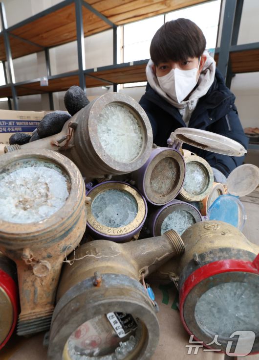 (수원=뉴스1) 김영운 기자 = 강력한 한파가 계속되고 있는 21일 경기 수원시 장안구 파장정수장 자재창고에서 수원시상수도사업소 직원이 추위에 동파된 수도계량기를 정리하고 있다. 2026.1.21/뉴스1