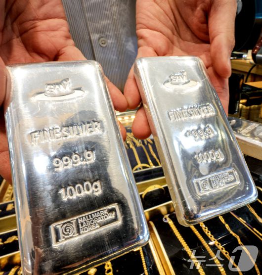 (서울=뉴스1) 이호윤 기자 = 도널드 트럼프 미국 대통령이 그린란드 확보를 위해 유럽 국가들에 대한 추가 관세 부과를 시사하자 금과 은 가격이 사상 최고 수준으로 치솟은 21일 서울 종로구 한 금은방에서 직원이 실버바를 정리하고 있다. 2026.1.21/뉴스1