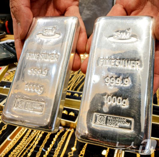 (서울=뉴스1) 이호윤 기자 = 도널드 트럼프 미국 대통령이 그린란드 확보를 위해 유럽 국가들에 대한 추가 관세 부과를 시사하자 금과 은 가격이 사상 최고 수준으로 치솟은 21일 서울 종로구 한 금은방에서 직원이 실버바를 정리하고 있다. 2026.1.21/뉴스1