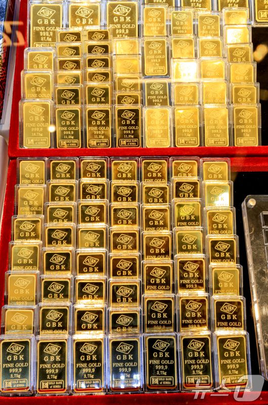 (서울=뉴스1) 이호윤 기자 = 도널드 트럼프 미국 대통령이 그린란드 확보를 위해 유럽 국가들에 대한 추가 관세 부과를 시사하자 금과 은 가격이 사상 최고 수준으로 치솟은 21일 서울 종로구 한 금은방에 골드바들이 진열돼 있다. 2026.1.21/뉴스1256@news1.krCopyright ⓒ 뉴스1. All rights reserved. 무단 전재 및 재배포, AI학습 이용 금지.