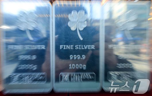 (서울=뉴스1) 이호윤 기자 = 도널드 트럼프 미국 대통령이 그린란드 확보를 위해 유럽 국가들에 대한 추가 관세 부과를 시사하자 금과 은 가격이 사상 최고 수준으로 치솟은 21일 서울 종로구 한 금은방에 실버바가 진열돼 있다. 2026.1.21/뉴스1256@news1.krCopyright ⓒ 뉴스1. All rights reserved. 무단 전재 및 재배포, AI학습 이용 금지.