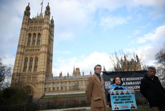영국 정부가 20일(현지시간) 유럽 최대 규모의 중국 대사관 신축 계획을 승인했다. 하원 밖에서 중국 대사관 신설에 반대하는 단체 '홍콩 노동권 모니터'와 '위구르 집단 학살 중단'이 기자회견을 하고 있다. 사진=로이터 연합뉴스 |