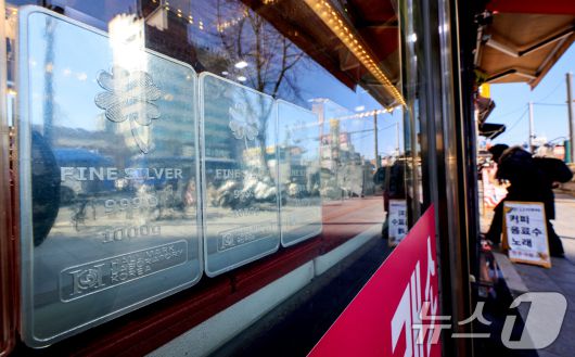 (서울=뉴스1) 이호윤 기자 = 도널드 트럼프 미국 대통령이 그린란드 확보를 위해 유럽 국가들에 대한 추가 관세 부과를 시사하자 금과 은 가격이 사상 최고 수준으로 치솟은 21일 서울 종로구 한 금은방에 실버바가 진열돼 있다. 2026.1.21/뉴스1256@news1.krCopyright ⓒ 뉴스1. All rights reserved. 무단 전재 및 재배포, AI학습 이용 금지.