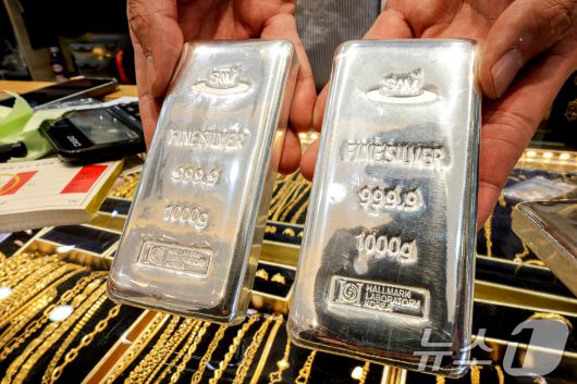 (서울=뉴스1) 이호윤 기자 = 도널드 트럼프 미국 대통령이 그린란드 확보를 위해 유럽 국가들에 대한 추가 관세 부과를 시사하자 금과 은 가격이 사상 최고 수준으로 치솟은 21일 서울 종로구 한 금은방에서 직원이 실버바를 정리하고 있다. 2026.1.21/뉴스1256@news1.krCopyright ⓒ 뉴스1. All rights reserved. 무단 전재 및 재배포, AI학습 이용 금지.