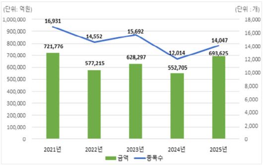 21일 한국예탁결제원에 따르면 2025년 ELS(ELB 포함) 발행 금액은 69조 3625억원으로 집계됐다. 이는 전년(55조 2705억원) 대비 25.5% 증가한 수치다.