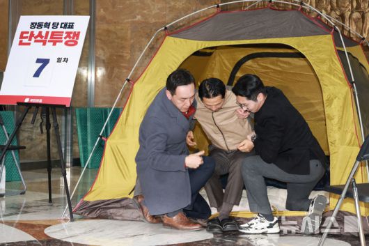 [서울=뉴시스] 고승민 기자 = 단식농성을 이레째 이어가고 있는 장동혁 국민의힘 대표가 21일 서울 여의도 국회 로텐더홀 농성장 텐트에서 부축을 받으며 일어서고 있다. 2026.01.21. kkssmm99@newsis.com